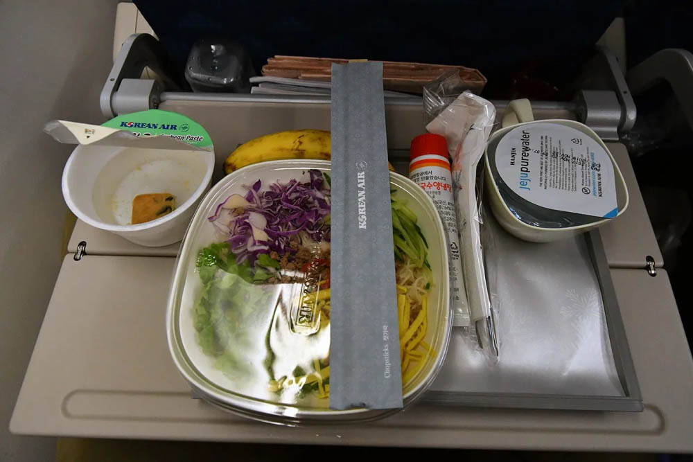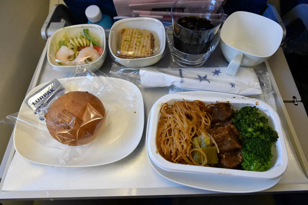 Через час после взлета бортпроводники начали разносить питание. Обед можно выбрать из трёх вариантов: острая говядина по-китайски, курица с карри и рисом или рыба. По отзывам пассажиров, предложенные блюда достаточно вкусные и отличаются от привычной еды в полёте.