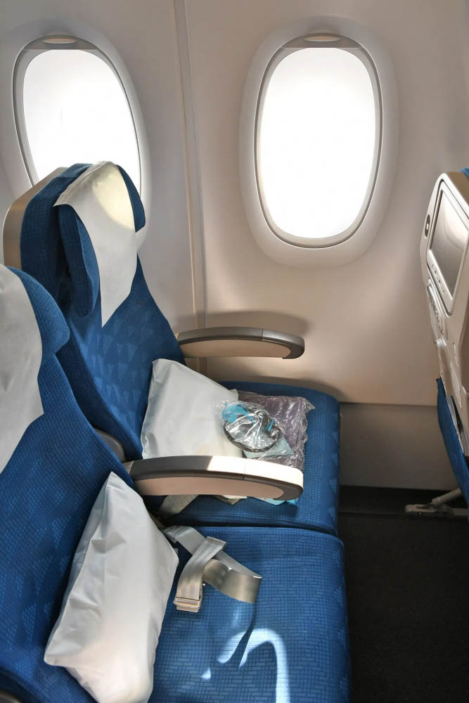 Пассажирам предложены персональные наборы, состоящие из подушки, одеяла, наушников и бутылки питьевой воды с острова Чеджу. Видеоинструкция по безопасности, которую демонстрируют перед взлётом, дублируется на английском языке. Также на дисплее можно наблюдать за тем, что происходит снаружи самолёта. Лайнер оборудован несколькими камерами, которые подключены к развлекательной системе.