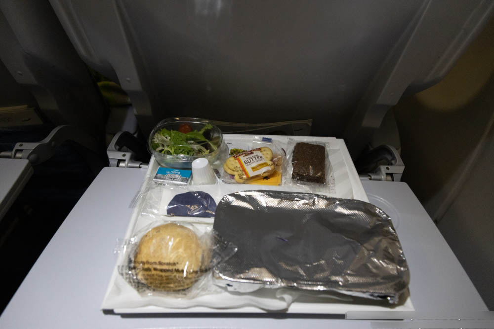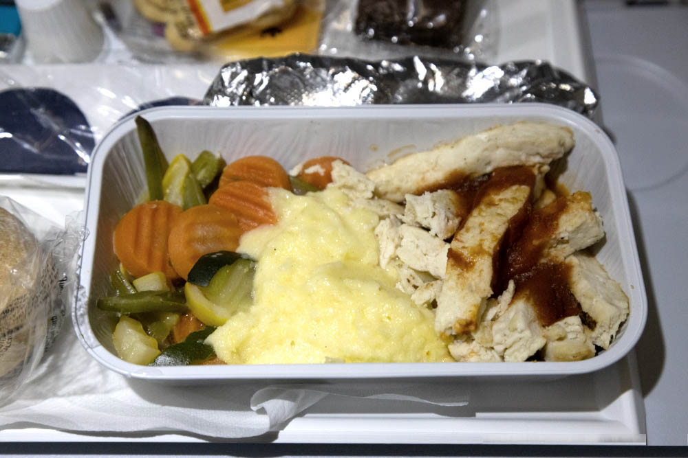 Путешественники в экономклассе могут выбрать одно из двух горячих блюд. Например, курицу с макаронами или с картофельным пюре. Обед также включает салат, булочку, крекер, соус, сливочное масло и пирожное в качестве десерта.