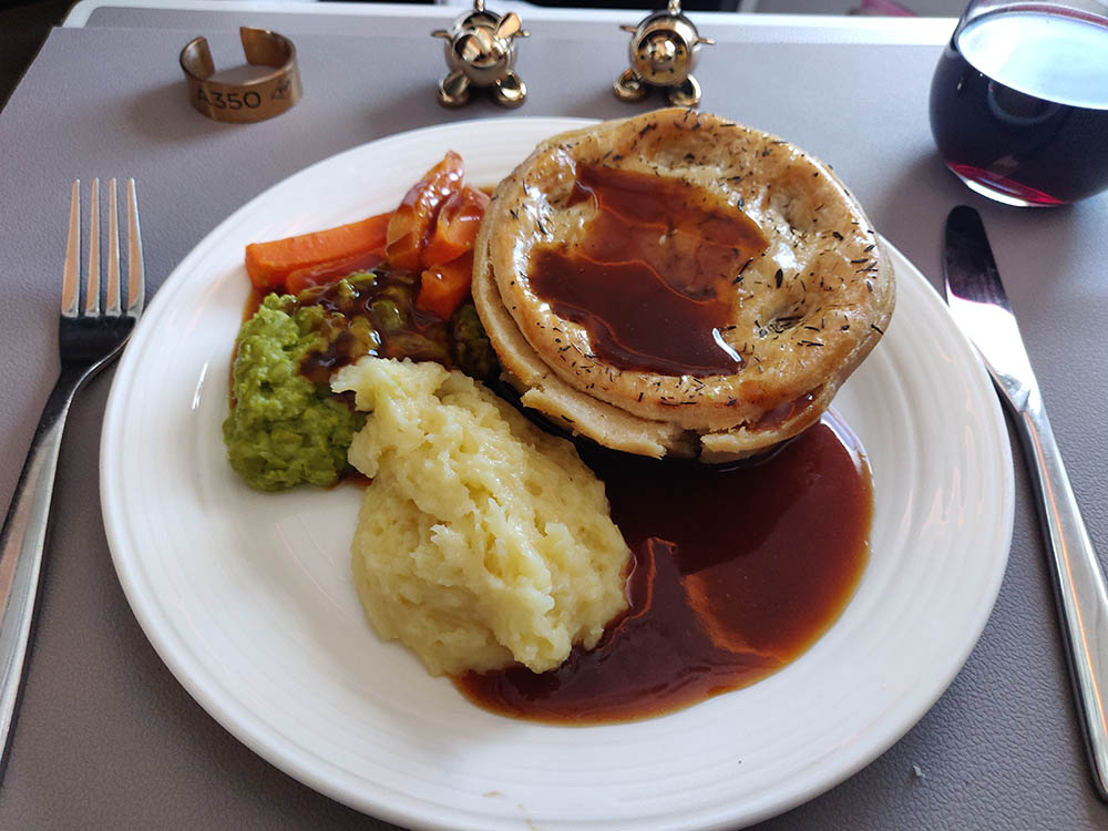 Как только самолёт набирает высоту, стюардессы начинают готовить питание. В меню: салат с креветками, Хертфордшинские рёбрышки и шоколадный торт с лесными орехами. Пластиковые контейнеры отсутствуют. Вместо них бортовое питание выкладывается на настоящие тарелки, ножи и вилки полностью металлические, а чай разливают не в бумажный стаканчик, а в кружку.