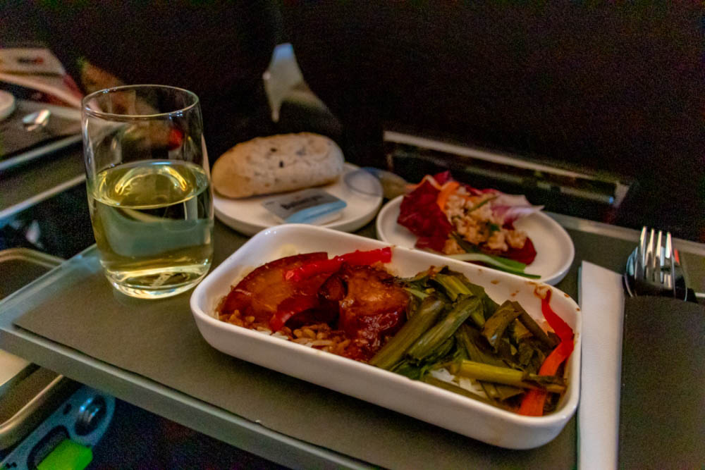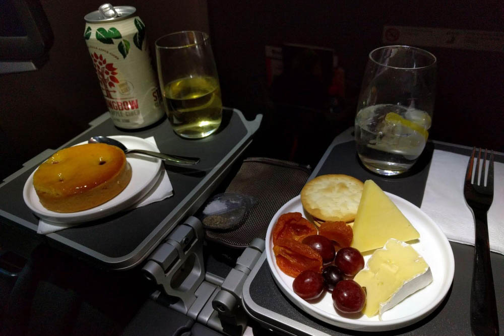 Питание во время рейса привычно пассажирам бизнес-класса. Jetstar сервирует несколько закусок, основное блюдо и десерт, используя керамическую посуду, стеклянные бокалы и металические столовые приборы.Пассажиров угощают прошутто и запечённой спаржей, в качестве горячего перелагают на выбор тушёные говяжьи ребра с полентой, овощное ризотто или рыбу баррамунди с лапшой. Подчеркнуть вкус блюд помогут несколько видов соусов — имбирный, соевый, томатный.