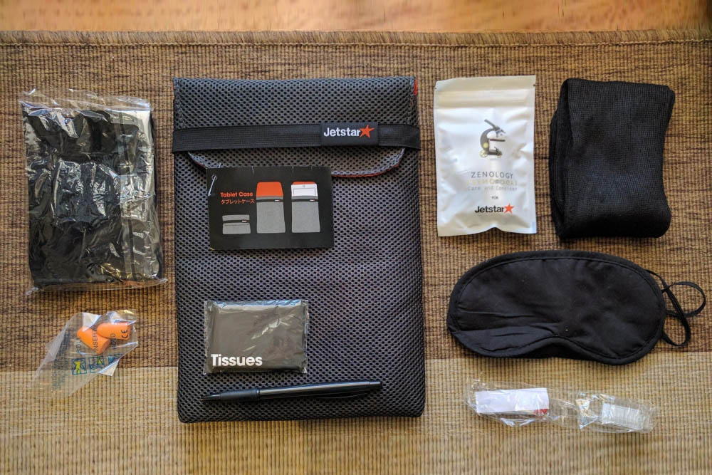 Путешественникам выдают дорожные наборы, в каждый из которых входит хлопковая косметичка с влажными салфетками, кремом для рук, бальзамом для губ, зубной щеткой и пастой, а также маска для глаз, беруши, носки, ручка и надувная подушка для шеи. В этом компоненте Jetstar точно отличилась — далеко не все авиаперевозчики заботятся о вашей шее, замечательный бонус. Чтобы комфортно разместиться в кресле можно дополнительно попросить одеяло и подушку.
