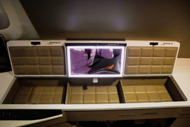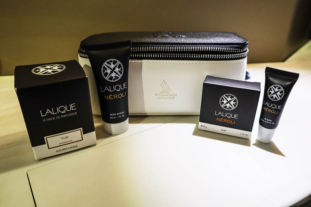 Из средств личной гигиены Singapore Airlines предоставляют пассажирам первого класса набор Lalique Amenity, который включает в себя: бальзам для губ, лосьон для тела, мыло и ароматическую свечу. Также у себя в сьюте вы найдёте маску для глаз, носки, тапочки и пижаму.