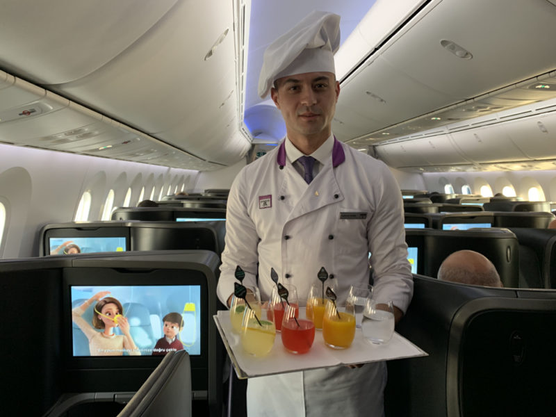 Перед взлётом в бизнес-классе разносят приветственные напитки (воду и свежевыжатый сок) и снеки.