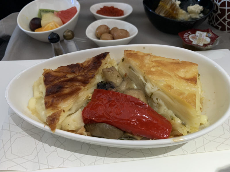 Как только самолёт набирает высоту, в салоне начинается подготовка к завтраку. Премиум-пассажирам сначала предлагают нарезку из сыра и свежих овощей. В качестве основного блюда — омлет или турецкая выпечка. Стоит отметить хлебную корзину, поскольку выбор хлебобулочных изделий действительно разнообразен.