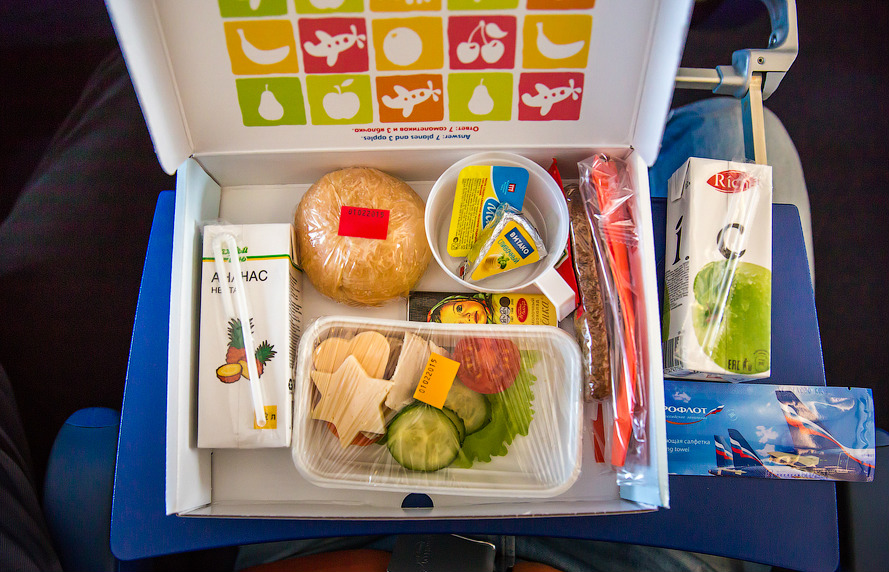 Через 20 минут, после того как самолет взлетит и наберет высоту, пассажирам предлагается питание. Если продолжительность полета менее трех часов, то рассчитывать можно только на выпечку, сладости или сэндвич. Плюс холодные и горячие напитки.