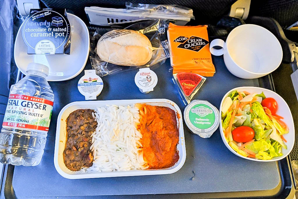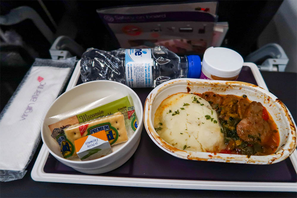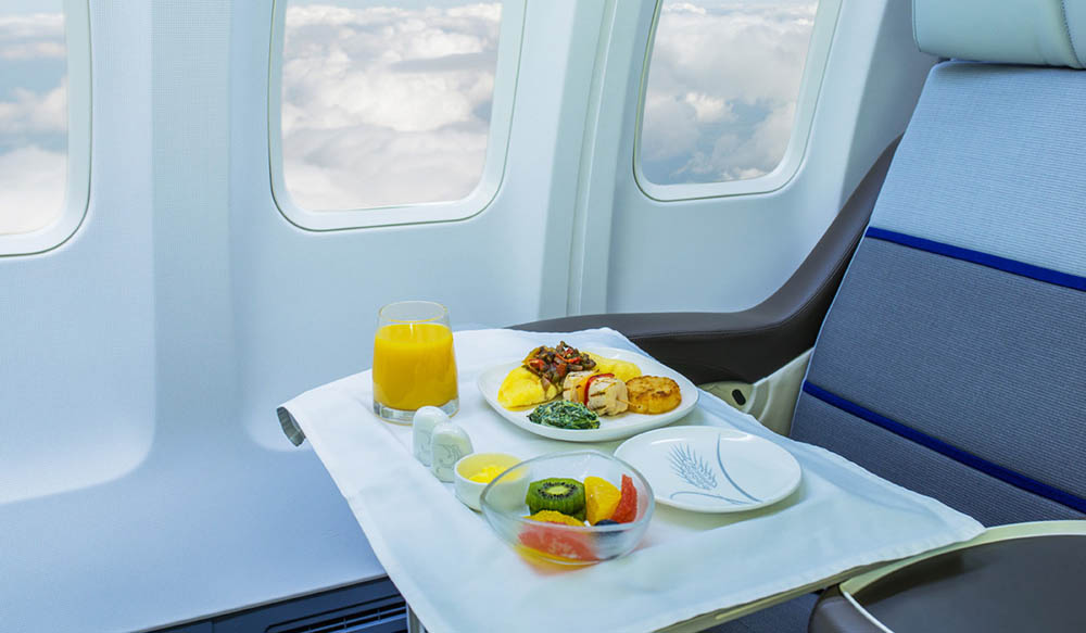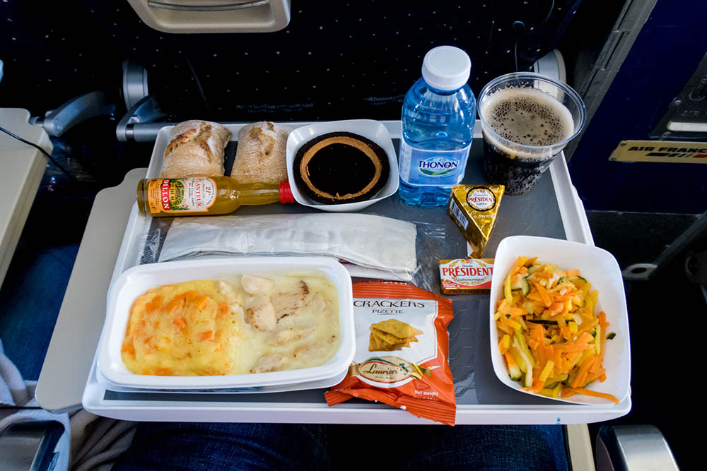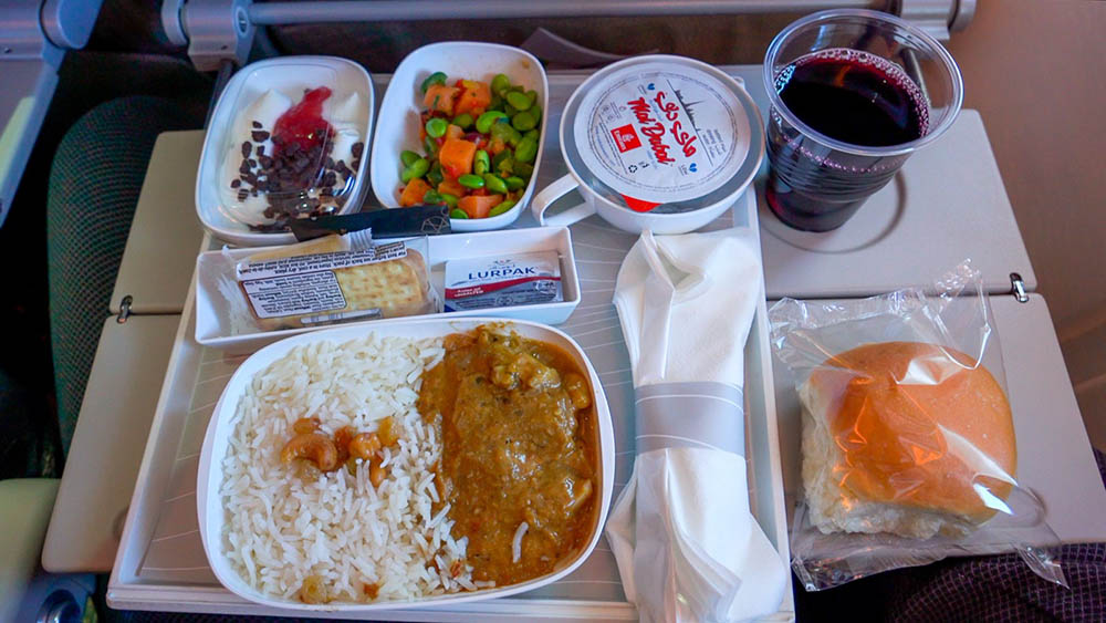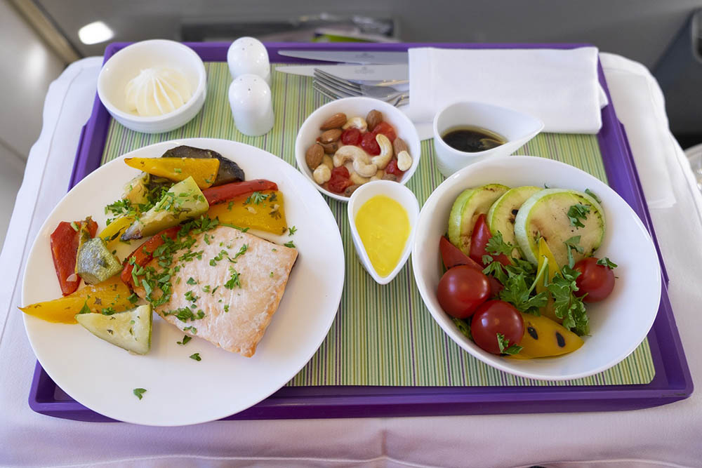 В меню экономкласса много овощных закусок, салатов с различными соусами, на горячее — рыба, курица, говядина. Также подают различные виды хлеба, десерты, горячий шоколад. Стоит отметить, что из напитков пассажирам предлагается широкий выбор вина, пива, коктейлей, фруктовых соков, которые доступны как во время еды, так и по запросу на протяжении всего полёта.