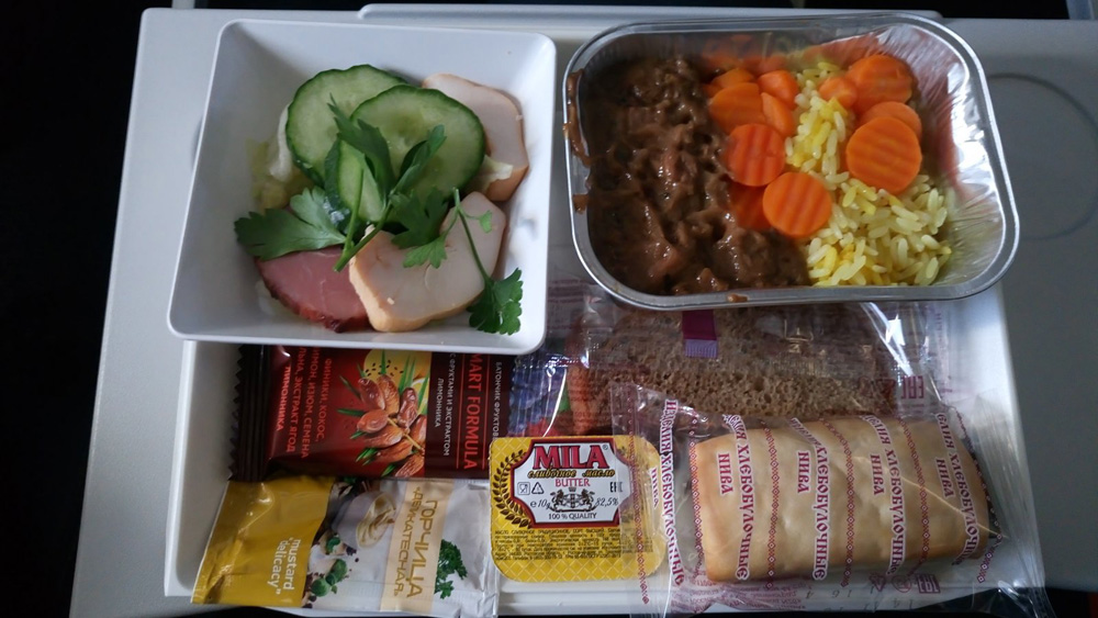 В течение всего полёта предлагают напитки — вода, сок, чай или кофе. Основное блюдо чаще всего мясное или рыбное (на выбор), с салатом и гарниром. Из сладкого — шоколадный батончик, вафля или какой-то подобный снек.