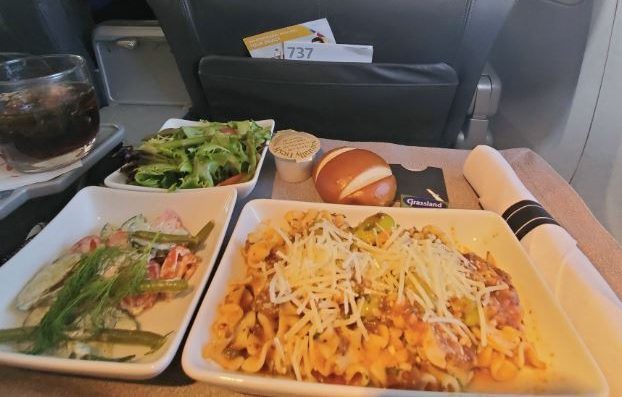 В бизнес-классе сразу заметно премиальное обслуживание: посуда, подача, сервировка. Меню также более разнообразно — мясные и рыбные закуски, овощные салаты, на горячее — блюда различных кухонь мира от ведущих шеф-поваров Америки.Qantas