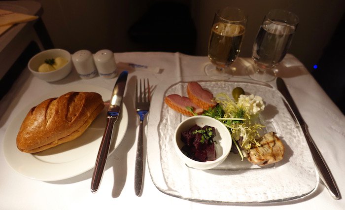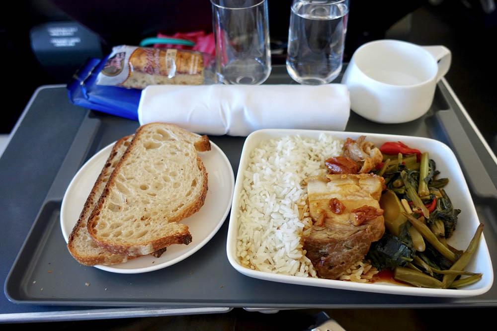Бизнес-обслуживание по стандартной схеме: аперитив с пиалой орехов, закуски, салаты и основное блюдо. Фарфоровая посуда, металлические приборы, красивая сервировка — перерыв на обед доставляет удовольствие.Хотя мы не можем судить о качестве и вкусе еды по фотографиям, но можно сказать с уверенностью, что блюда, которые подают пассажирам бизнес-класса, выглядят куда приятнее и аппетитнее. На подносах все аккуратно уложено на салфетках, на настоящей посуде, нередко с серебряными столовыми приборами. В эконом-классе пассажирам предлагают блюда в одноразовой посуде. Никакой эстетики.