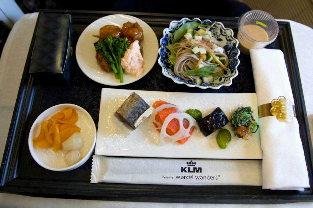 Меню бизнес-класса авиакомпании KLM разработал всемирно известный шеф-повар Джонни Бур, который является одним из немногих обладателей пяти звёзд Мишлен. Для пассажиров он создал несколько видов изысканных закусок, основных блюд и десертов. Также путешественникам во время рейса предложена богатая винная карта, составленная лучшими сомелье. Ну, и не будем забывать, что каждого бизнес-туриста на борту традиционно встречают бокалом шампанского.