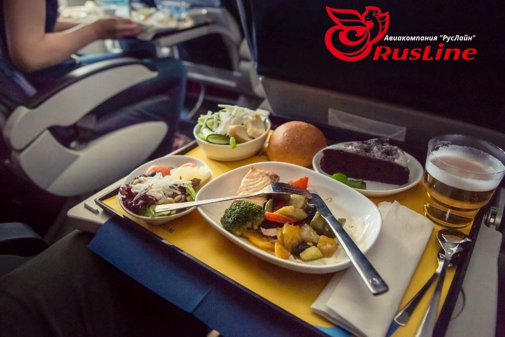 Питание в экономклассе авиакомпании «РусЛайн» зависит от длительности рейса. В течение коротких перелётов путешественникам предложены только прохладительные напитки. Длительные рейсы подразумевают холодные закуски или полноценное горячее питание и горячие напитки.