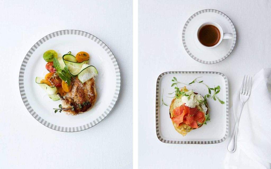Варианты десерта включают лимонный пирог с черникой с изображением ангела, в то время как завтрак включает в себя lox яйца, бенедикт, который подается с цельной пшеничной английской булочкой, чистым сливочным сыром и копченым лососем, омлетом из яиц и голландским соусом из йогурта.