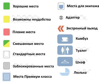 Самые лучшие места считаются в 41 и 42 ряду, поскольку аварийный выход расположен спереди, расстояние для ног комфортное, максимально откидываются спинки кресел. Также комфортны места премиум класса, за исключением ряда 31.