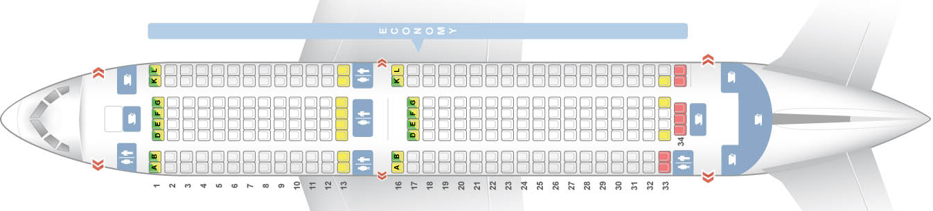 - 34 D, E, F, G, K, L — спинки кресел зафиксированы, расстояние между креслами уменьшено, столик расположен не удобно, также соседство с туалетами и кухонной зоной доставляет излишние хлопоты.