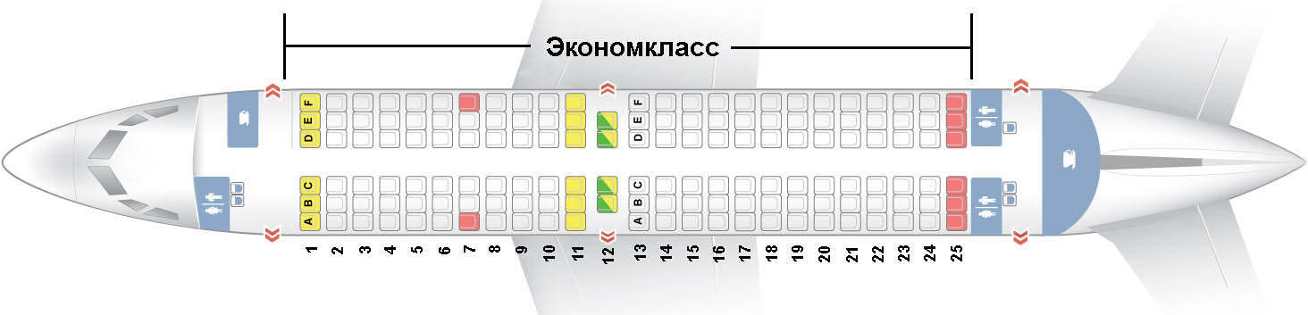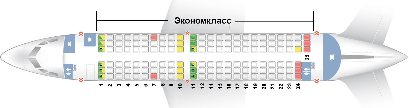 - Ряд 25. Самый неудобный. Сразу за ним находятся туалеты, из которых может доноситься неприятный запах, а пассажиры, ожидающие своей очереди в туалет, могут толкать и мешать.