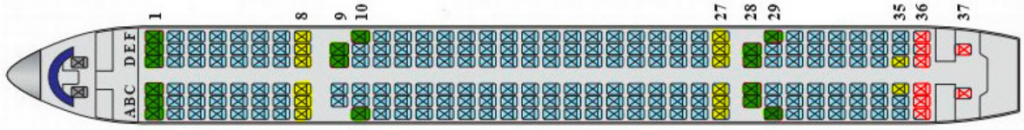 - 29-35 ряды. Стандартные места. Следует учесть, что в хвостовой части шумно из-за близости двигателей, а также на этих рядах больше болтает.